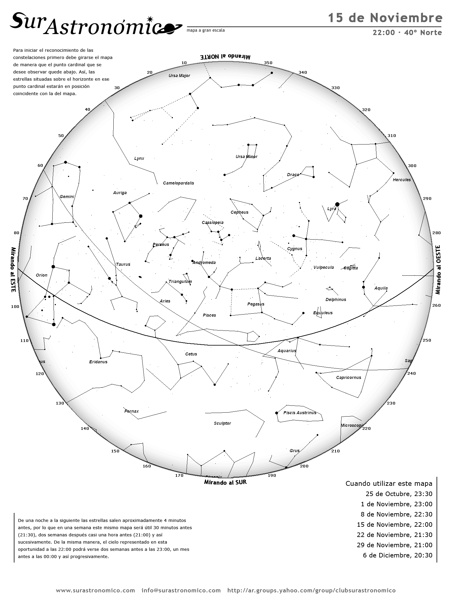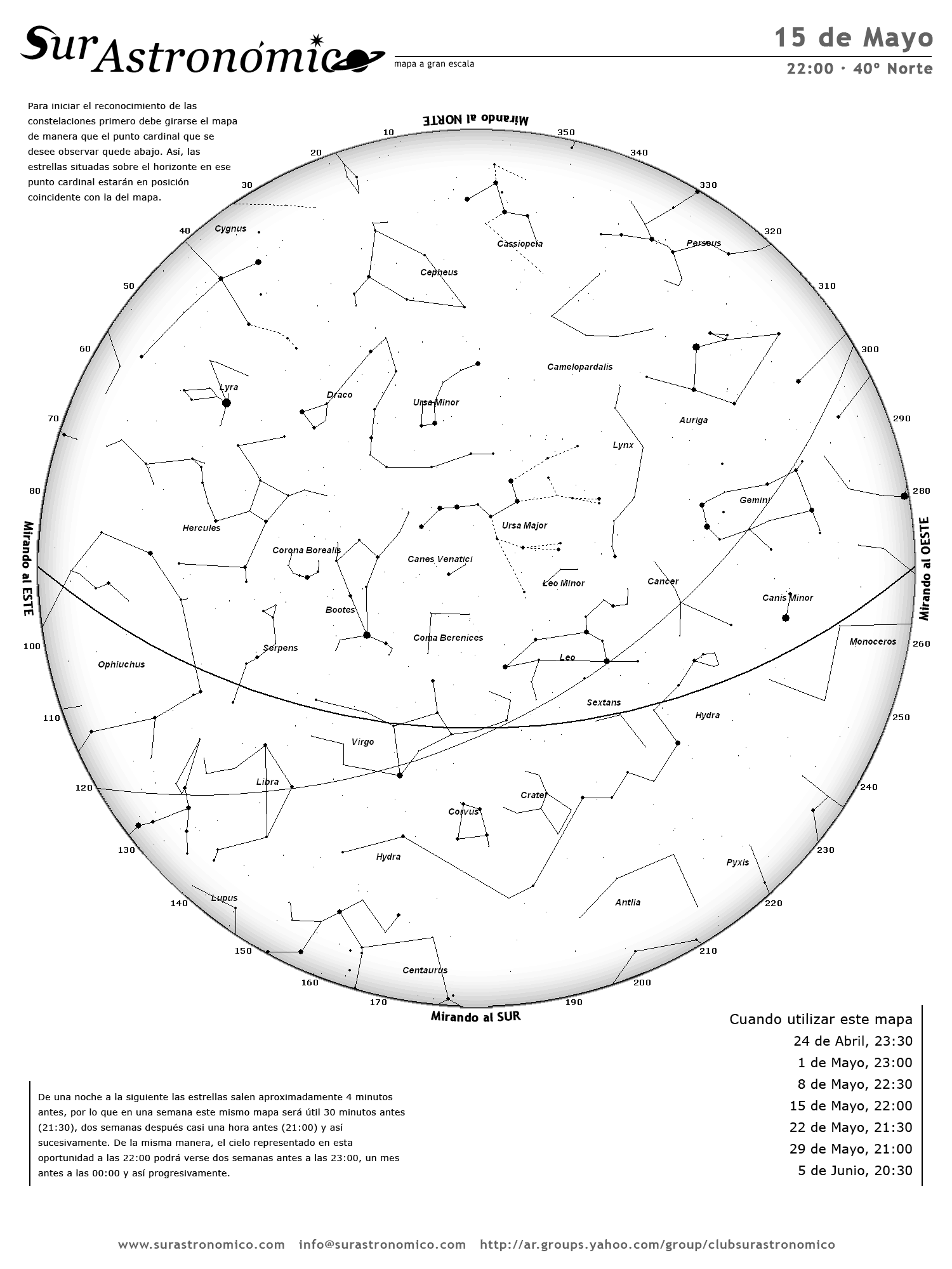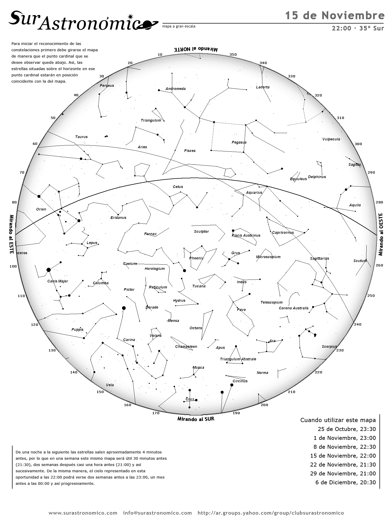 - De una noche a la siguiente las estrellas salen aproximadamente 4 minutos antes, por lo que en una semana este mismo mapa será útil 30 minutos antes (21:30), dos semanas después casi una hora antes (21:00) y así sucesivamente. De la misma manera, el cielo representado en esta oportunidad a las 22:00 podrá verse dos semanas antes a las 23:00, un mes antes a las 00:00 y así progresivamente.