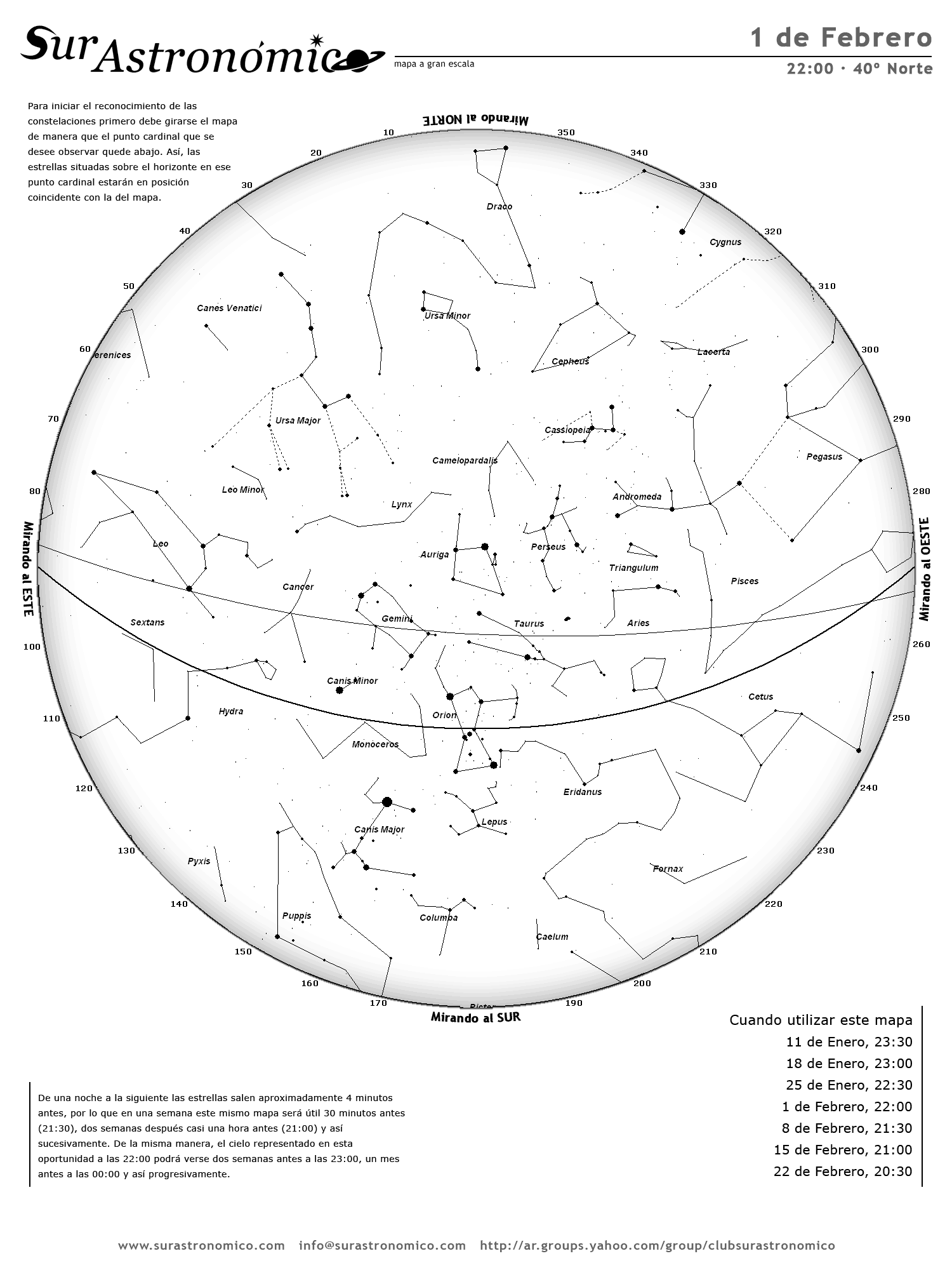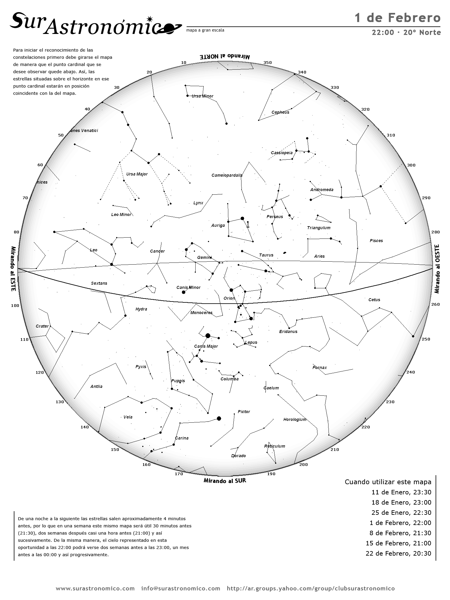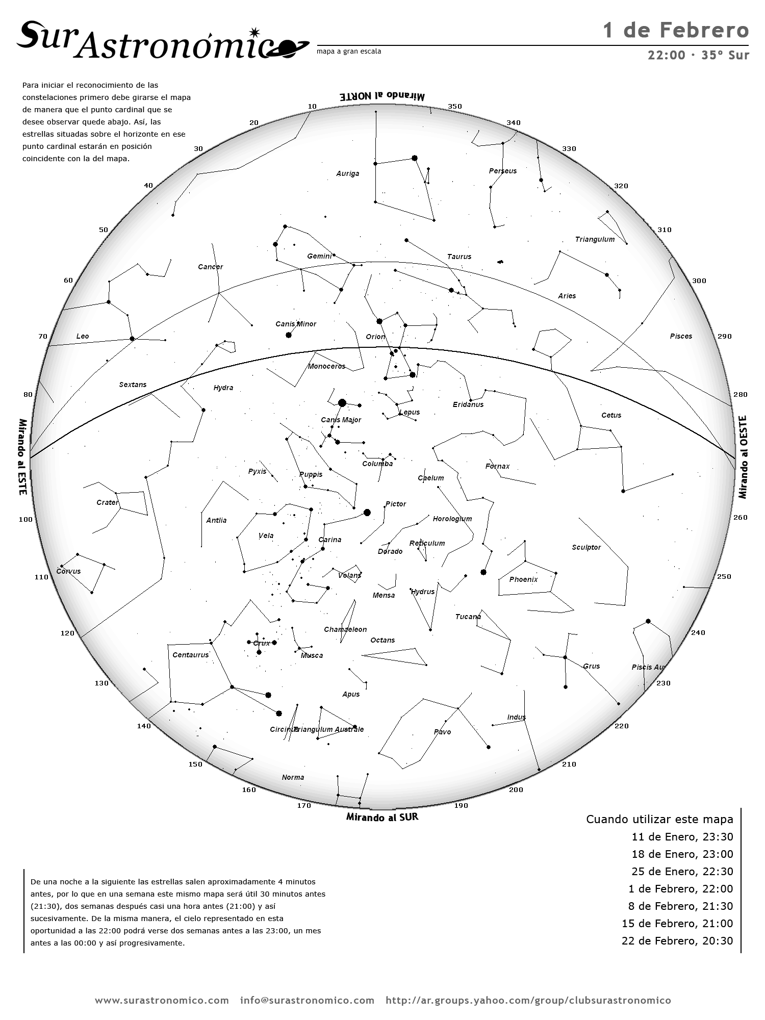 - De una noche a la siguiente las estrellas salen aproximadamente 4 minutos antes, por lo que en una semana este mismo mapa será útil 30 minutos antes (21:30), dos semanas después casi una hora antes (21:00) y así sucesivamente. De la misma manera, el cielo representado en esta oportunidad a las 22:00 podrá verse dos semanas antes a las 23:00, un mes antes a las 00:00 y así progresivamente.