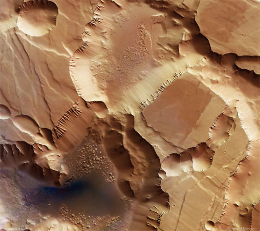 La nave Mars Express de la Agencia Espacial Europea tomó imágenes de alta resolución con la cámara High-Resolution Stereo Camera (HRSC) de la zona llamada Noctis Labyrinthus en Marte. Esta zona se localiza aproximadamente a 6.5º Sur y 260º Este. En la fotografía el Sol ilumina la superficie desde el noroeste, arriba a la derecha en la imagen. La región está localizada en el margen oeste de Valles Marineris.
