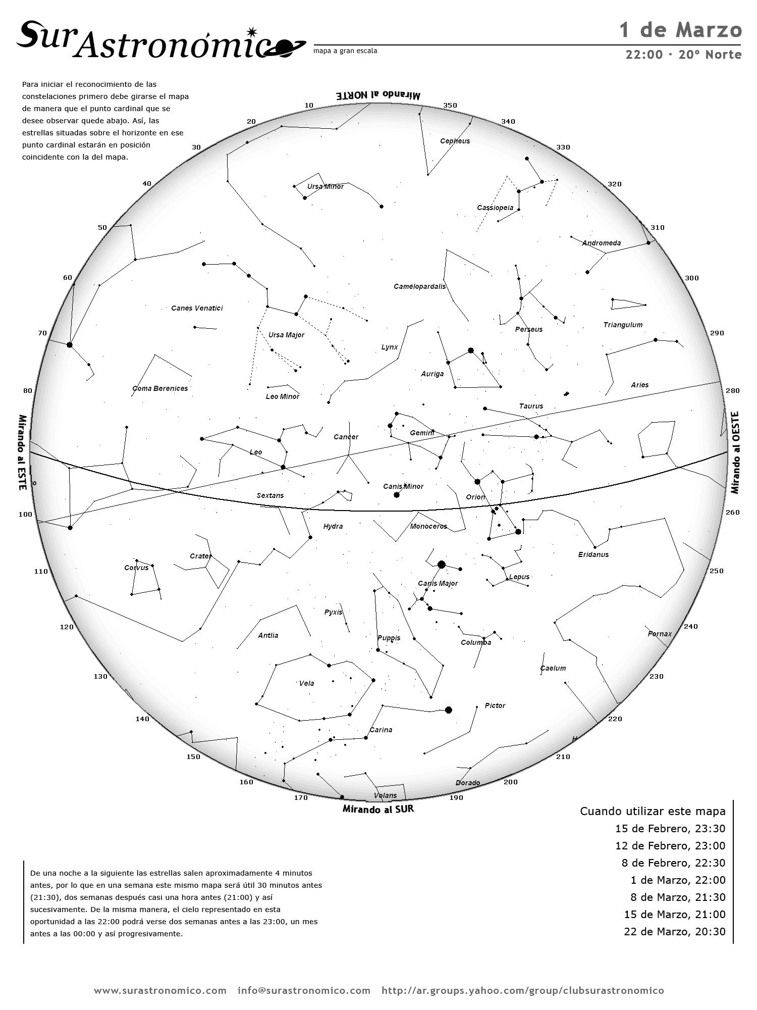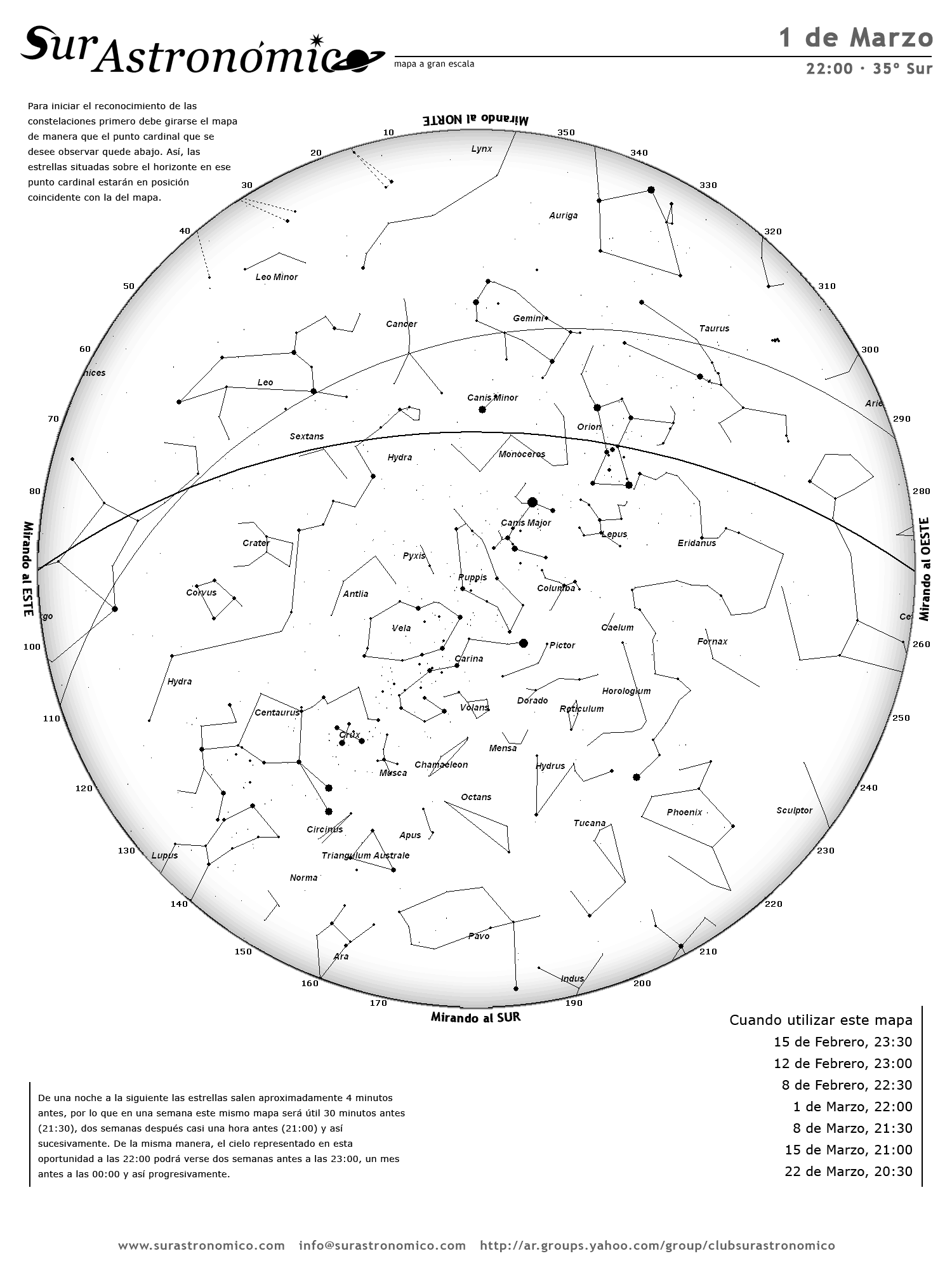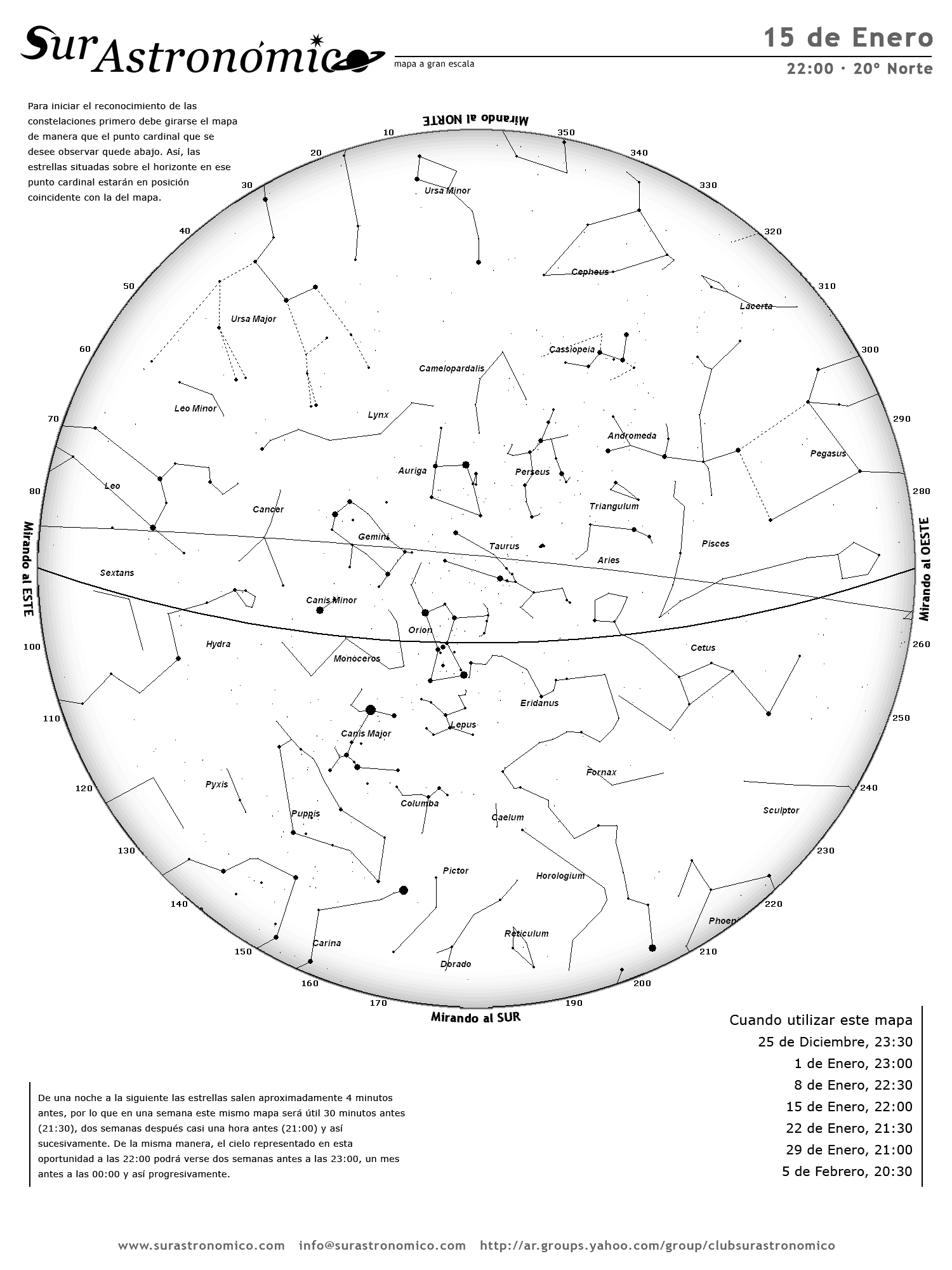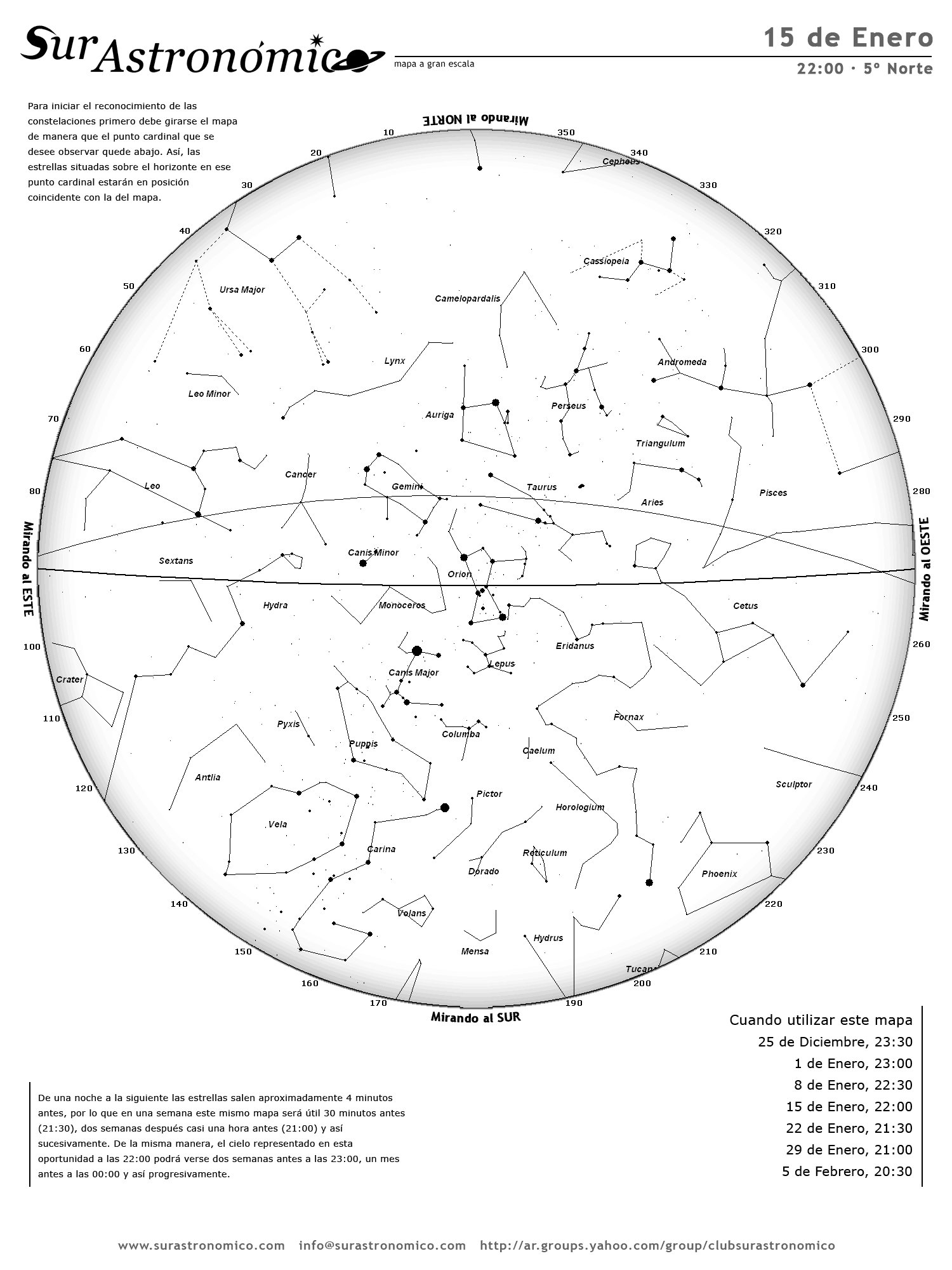 - De una noche a la siguiente las estrellas salen aproximadamente 4 minutos antes, por lo que en una semana este mismo mapa será útil 30 minutos antes (21:30), dos semanas después casi una hora antes (21:00) y así sucesivamente. De la misma manera, el cielo representado en esta oportunidad a las 22:00 podrá verse dos semanas antes a las 23:00, un mes antes a las 00:00 y así progresivamente.