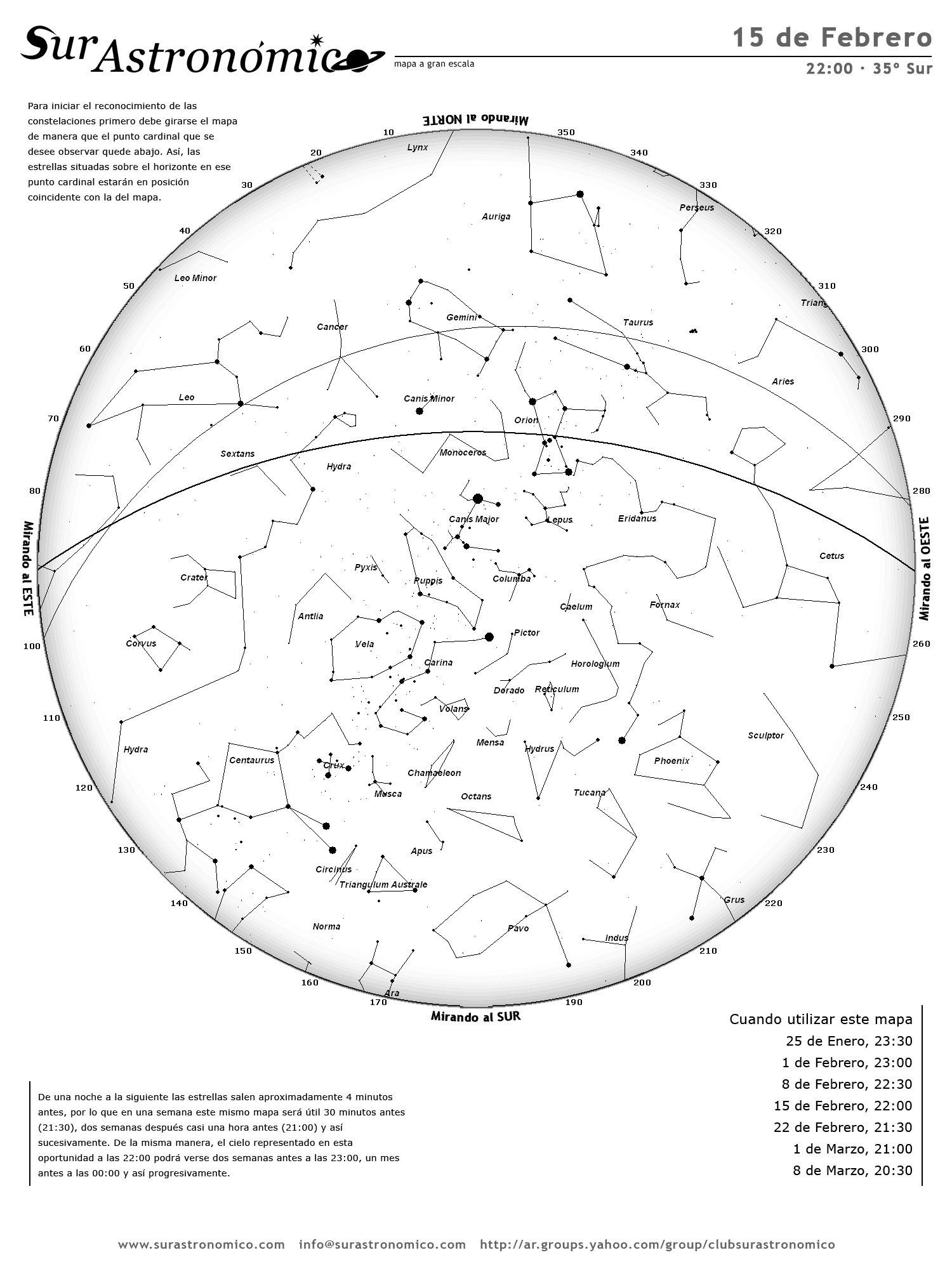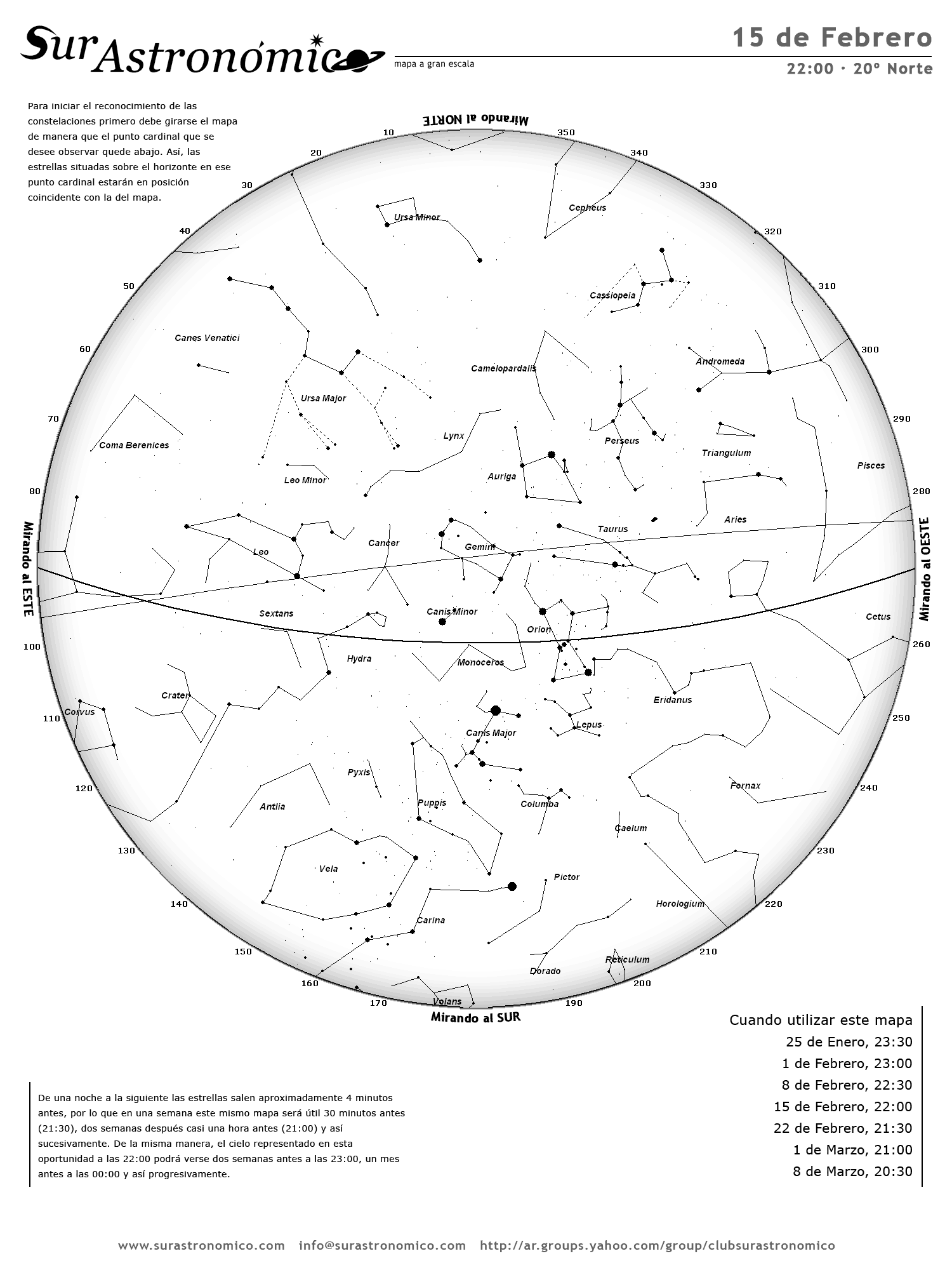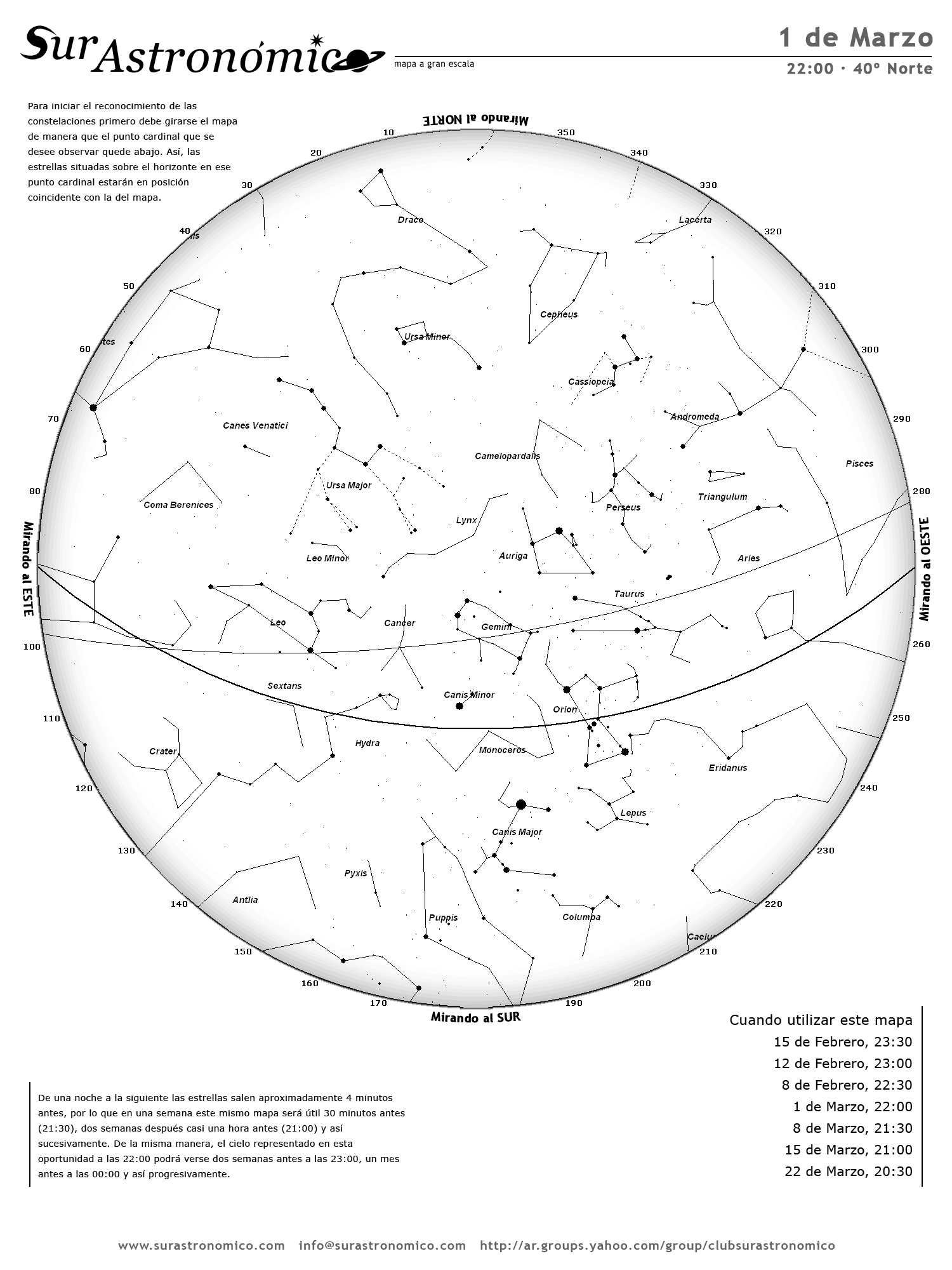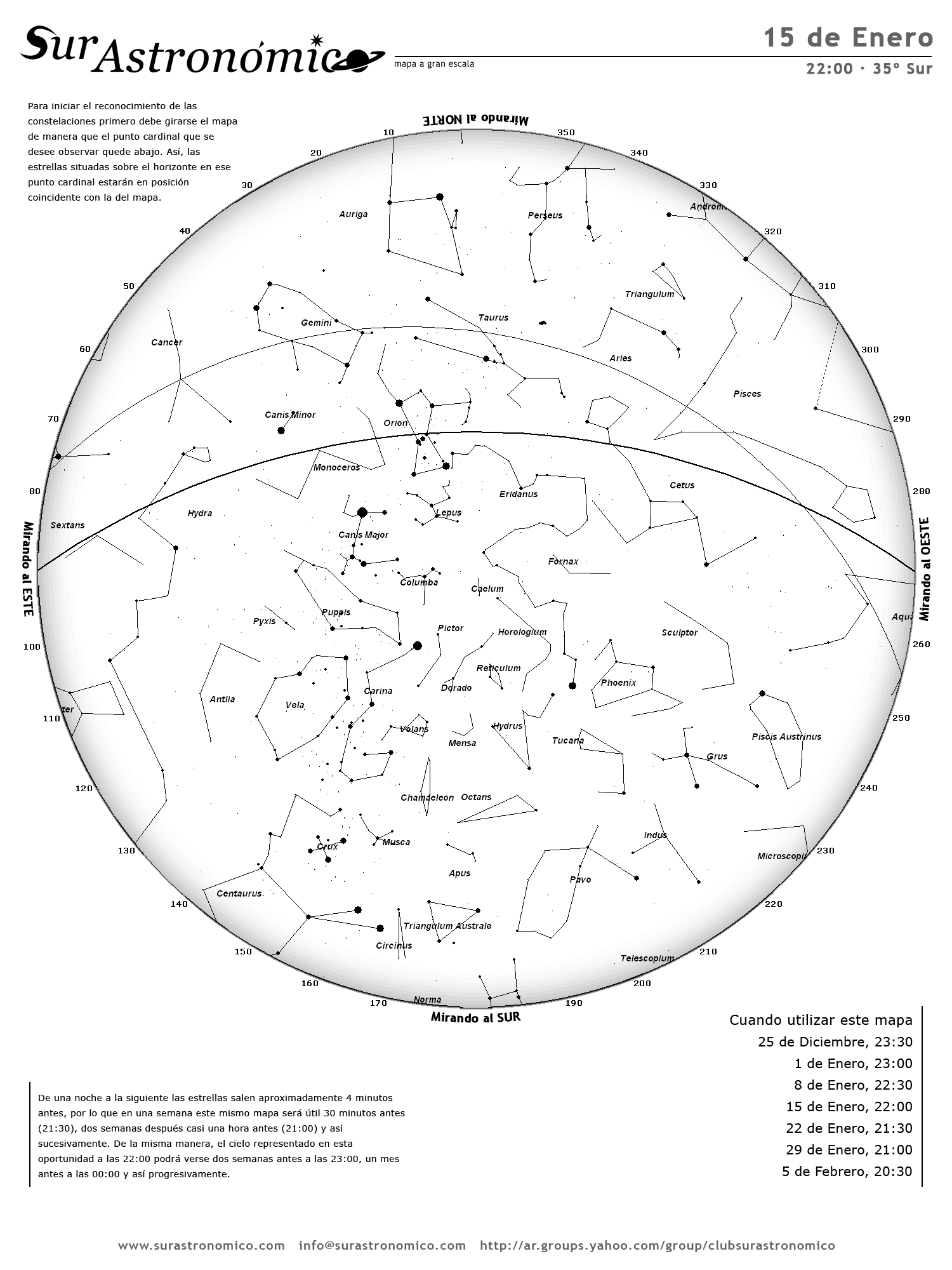 - De una noche a la siguiente las estrellas salen aproximadamente 4 minutos antes, por lo que en una semana este mismo mapa será útil 30 minutos antes (21:30), dos semanas después casi una hora antes (21:00) y así sucesivamente. De la misma manera, el cielo representado en esta oportunidad a las 22:00 podrá verse dos semanas antes a las 23:00, un mes antes a las 00:00 y así progresivamente.