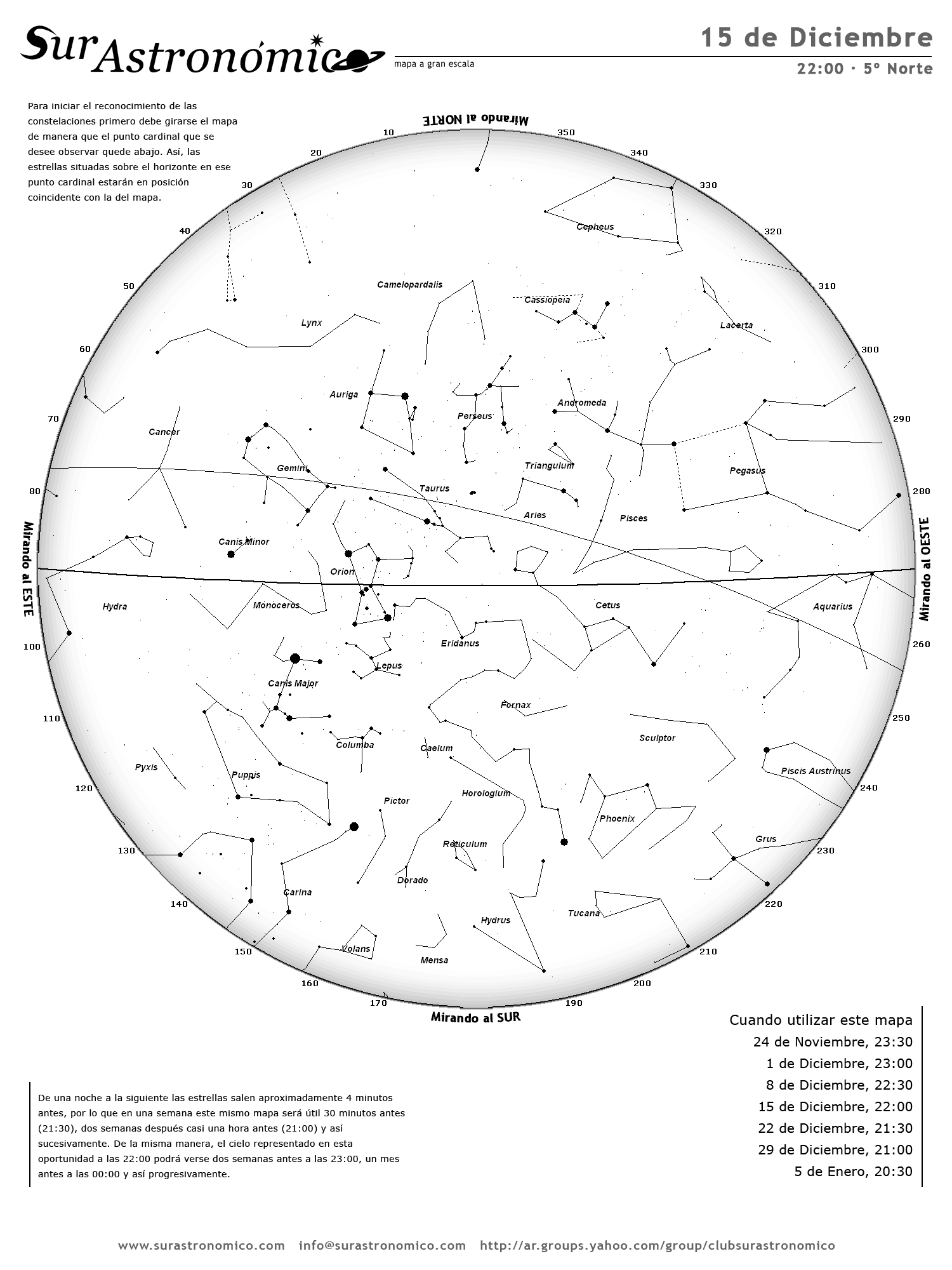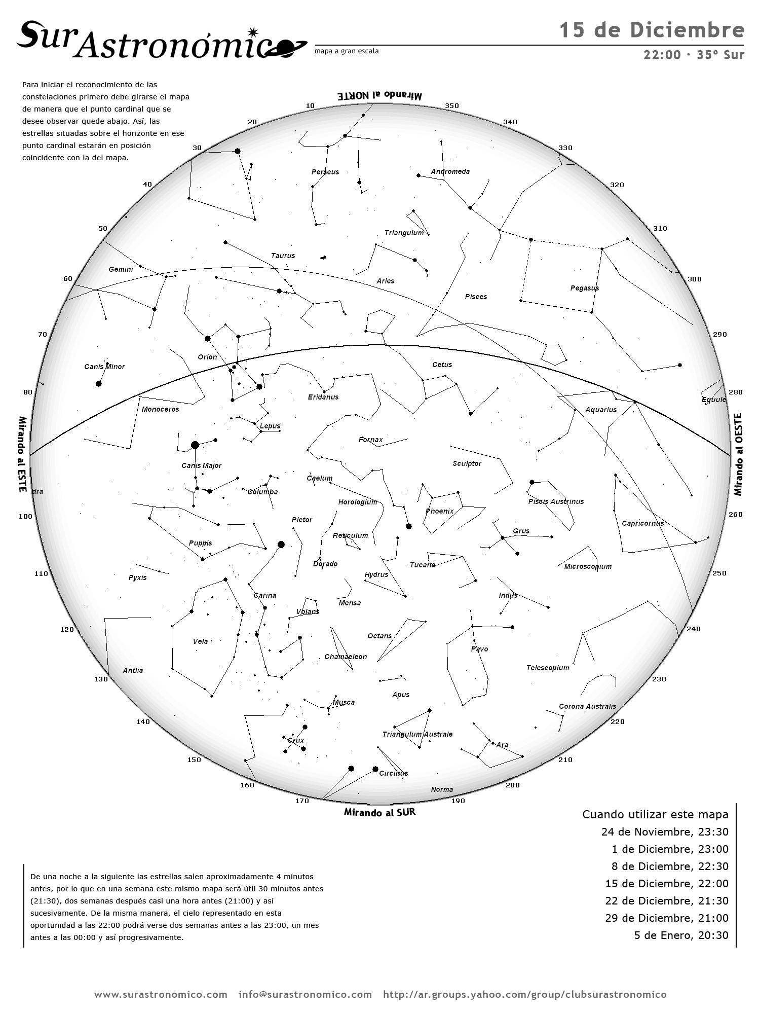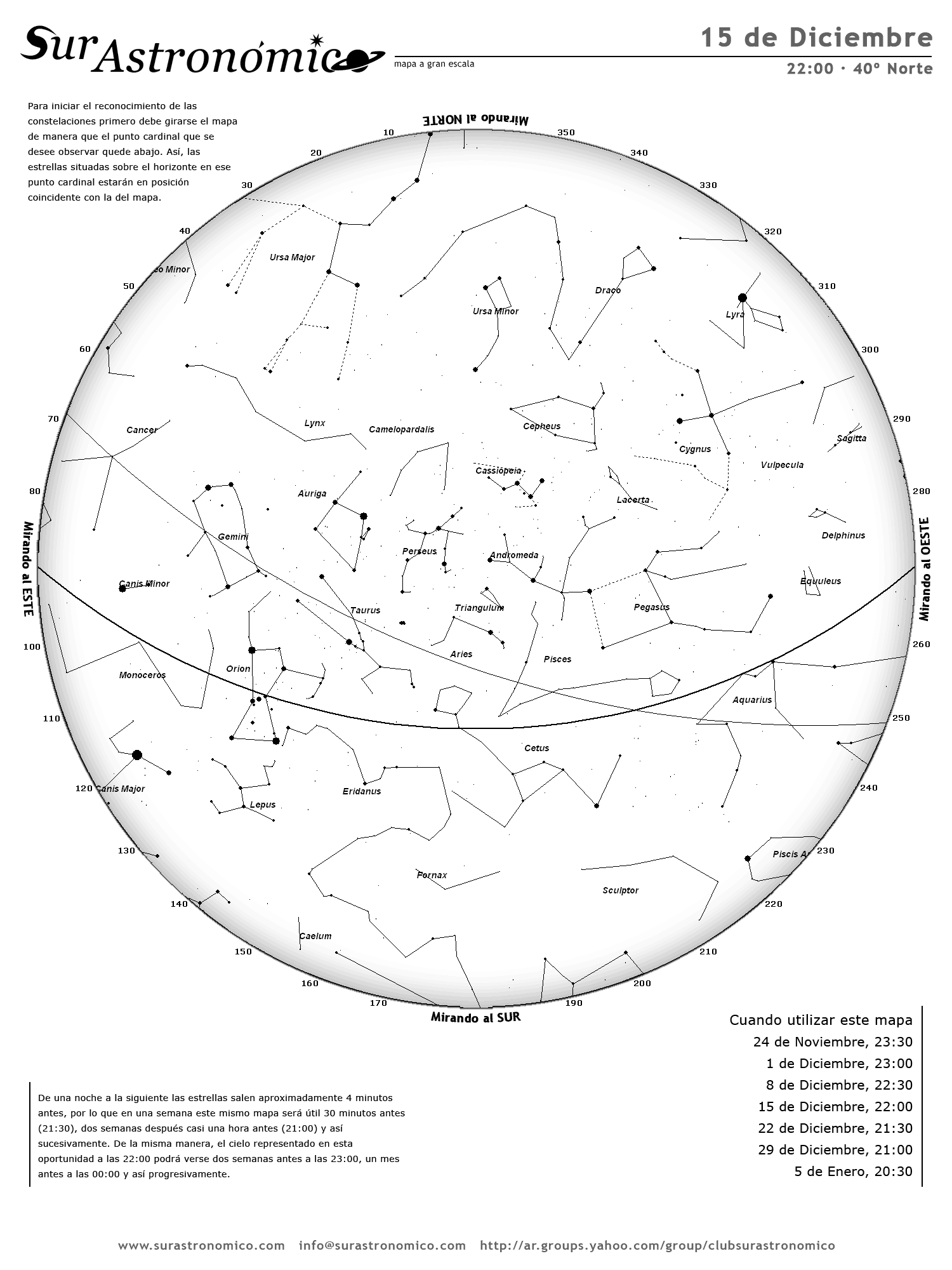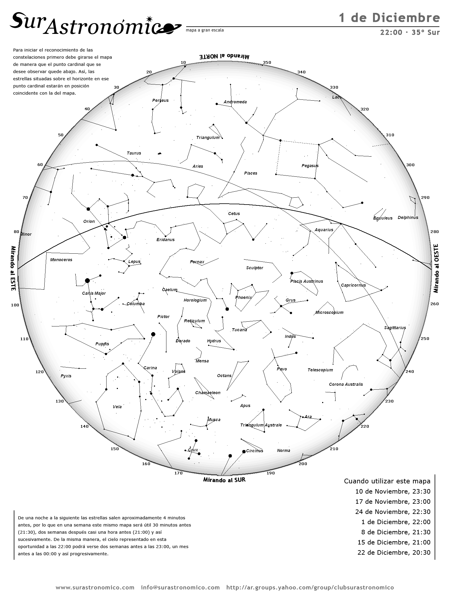 • De una noche a la siguiente las estrellas salen aproximadamente 4 minutos antes, por lo que en una semana este mismo mapa será útil 30 minutos antes (21:30), dos semanas después casi una hora antes (21:00) y así sucesivamente. De la misma manera, el cielo representado en esta oportunidad a las 22:00 podrá verse dos semanas antes a las 23:00, un mes antes a las 00:00 y así progresivamente.