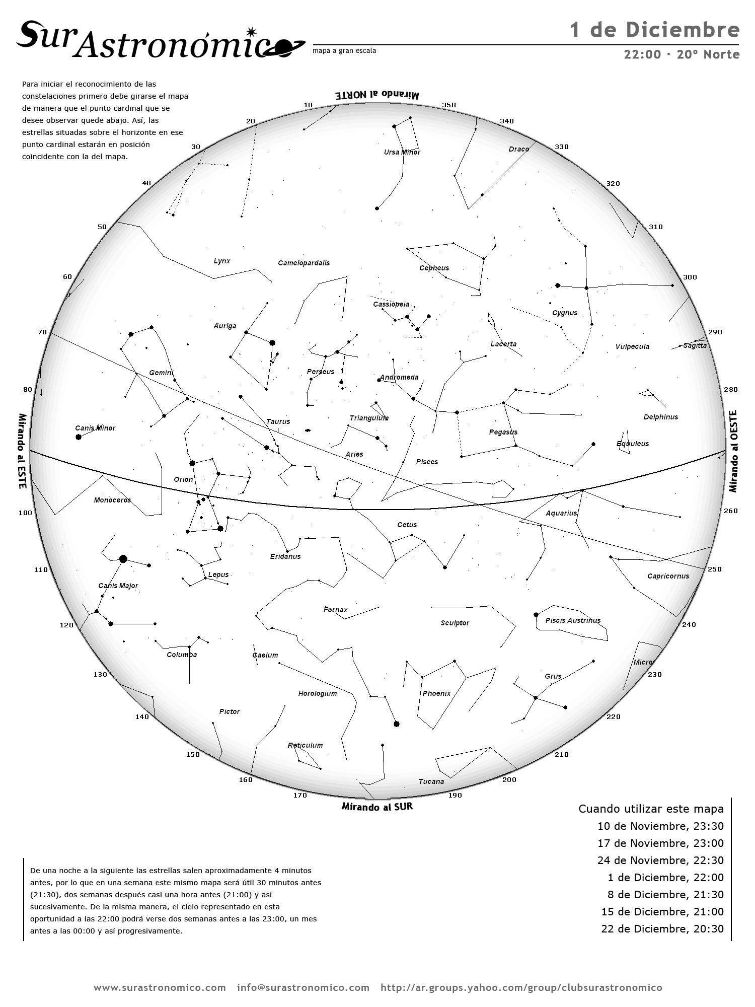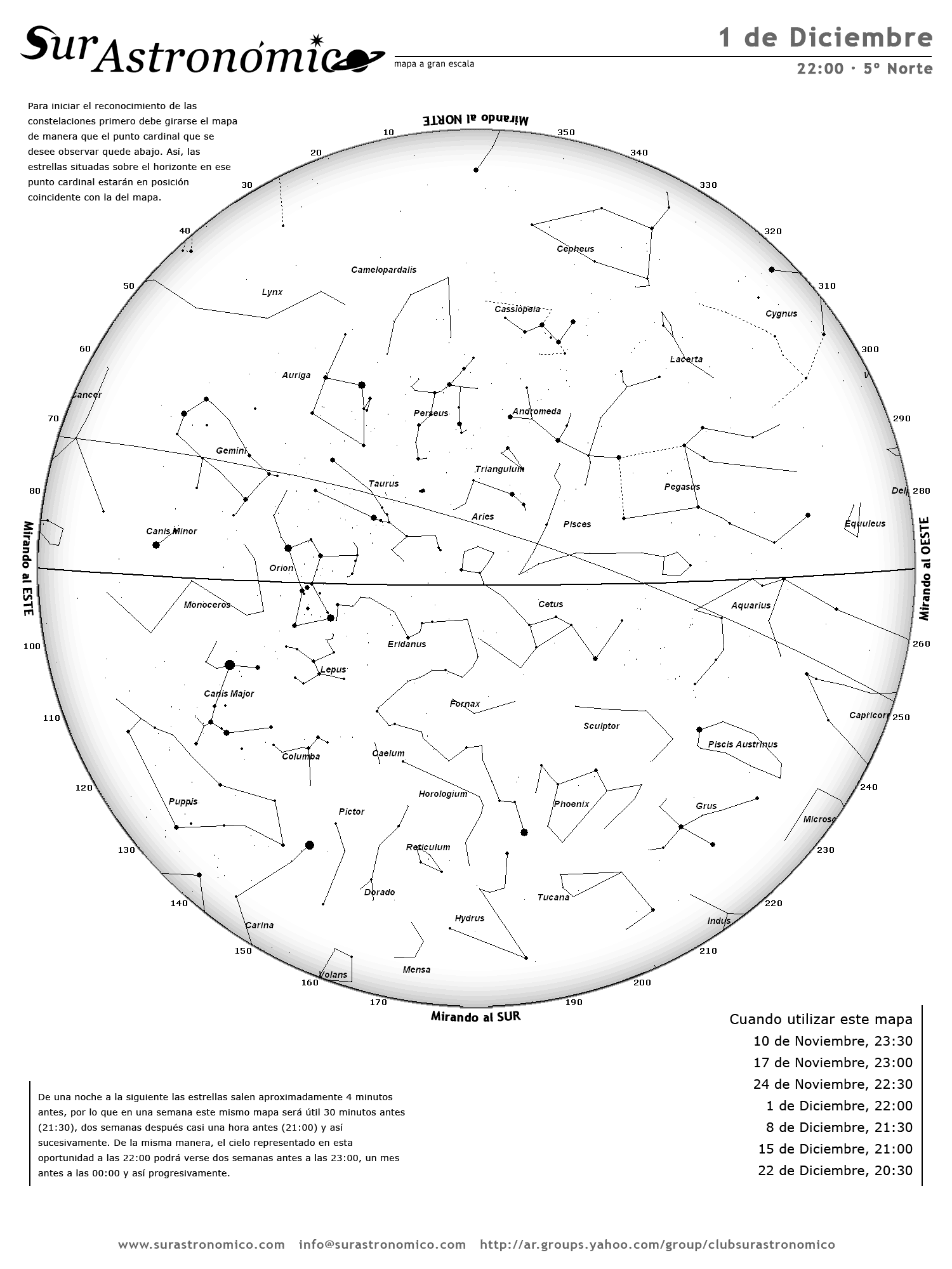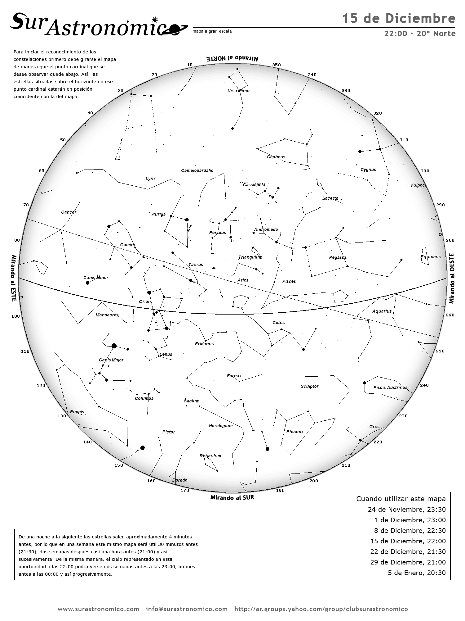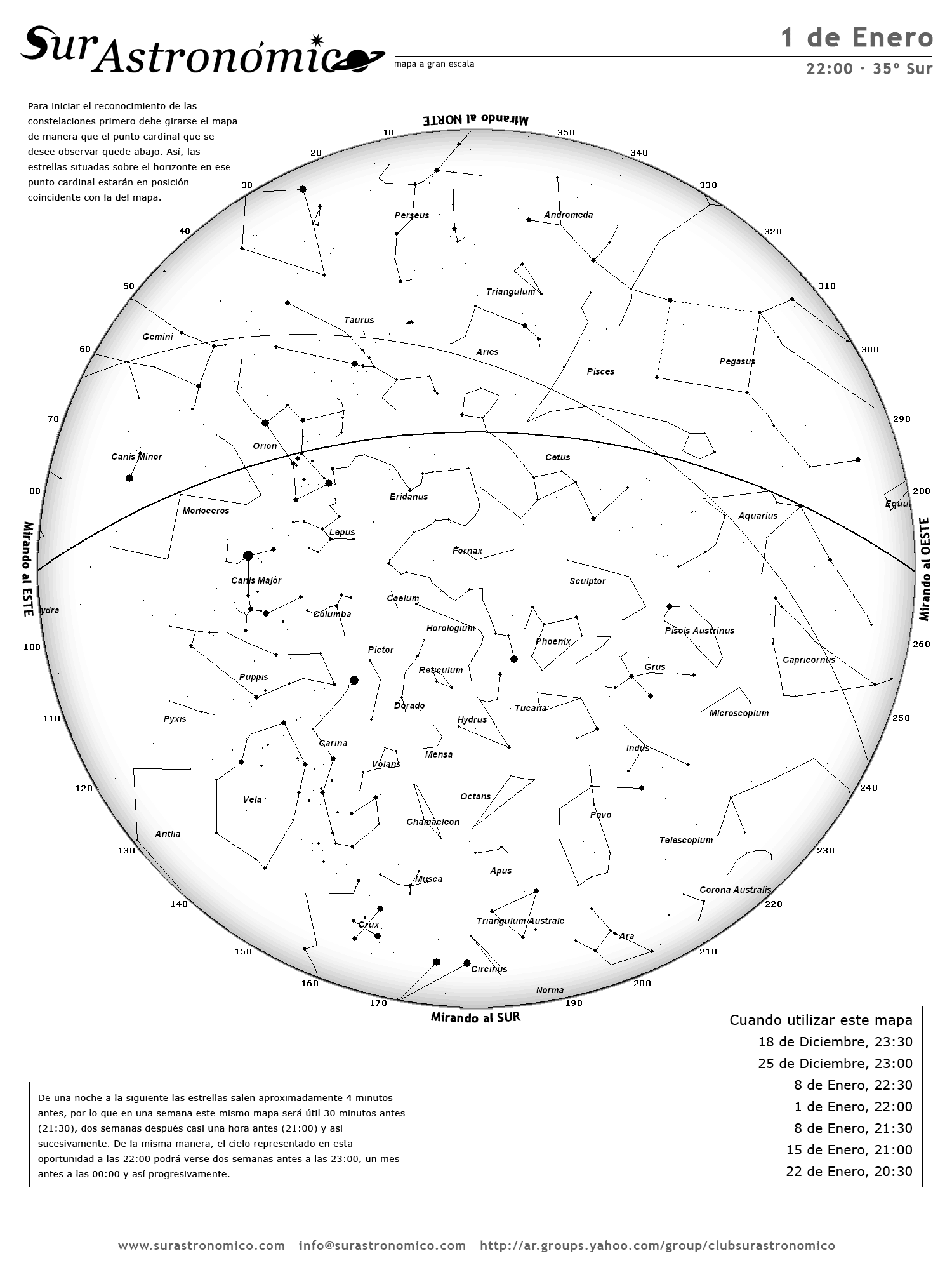 • De una noche a la siguiente las estrellas salen aproximadamente 4 minutos antes, por lo que en una semana este mismo mapa será útil 30 minutos antes (21:30), dos semanas después casi una hora antes (21:00) y así sucesivamente. De la misma manera, el cielo representado en esta oportunidad a las 22:00 podrá verse dos semanas antes a las 23:00, un mes antes a las 00:00 y así progresivamente.